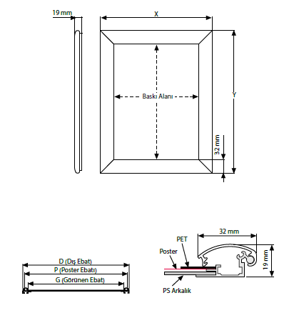 32 mm Profile - Suitable for each dimension posters. - Standar color is silver eloxal. - Different color alternatives can implement. - miter and rondo have corner connection